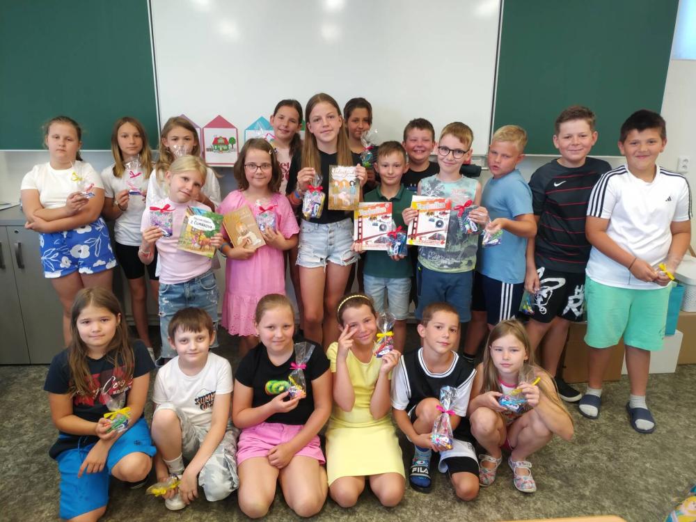 Poslední společné dny ve škole jsme si užili úklidem třídy, skříněk, rozdáním krásných výtvarných obrázků, sportovně na hřišti s vybíjenou, kopanou nebo prolézačkami. Hráli jsme různé hry, luštili křížovky a osmisměrky. Úžasným a nečekaným zážitkem bylo akrobatické představení v šapitó, kde artista během svého gymnastického výkonu upekl všem výborný moučník. K závěru školního roku patří také vyhodnocení nejlepších žáků třídy. Aurelka Buliščaková a Tomášek Kozák zvítězili v třídní hře, a protože jsou oba sportovci, vyhráli míč. Knižní odměnu za celoroční snahu, aktivitu, výborné výsledky, účast a umístění se v soutěžích, nejaktivnějšího čtenáře získala Klárka Daňková, Johanka Jordánová, Petřík Kráčman, Aury Buliščaková a Tomášek Kozák. Věřím, že příští rok bude oceněných ještě více, protože se děti jistě bude snažit vítězům vyrovnat.