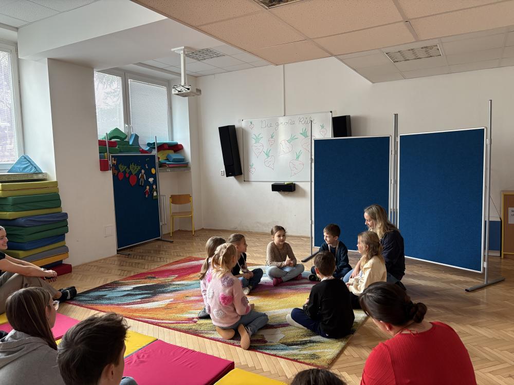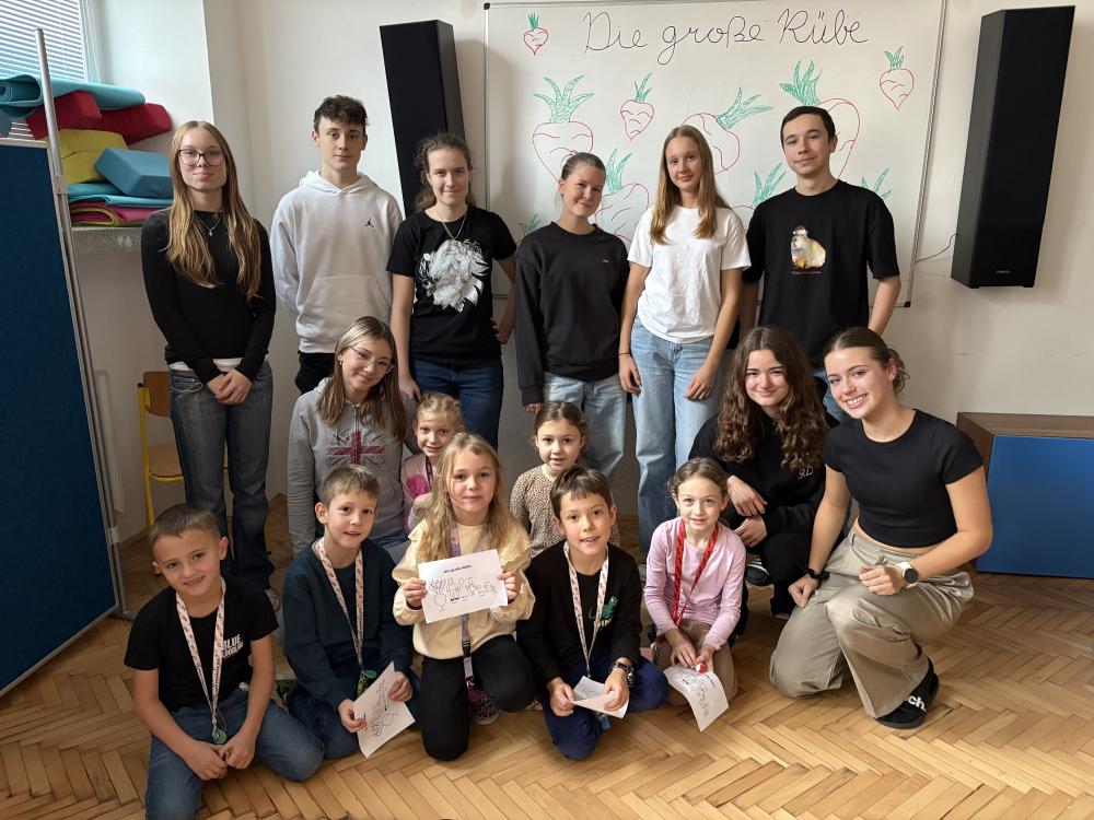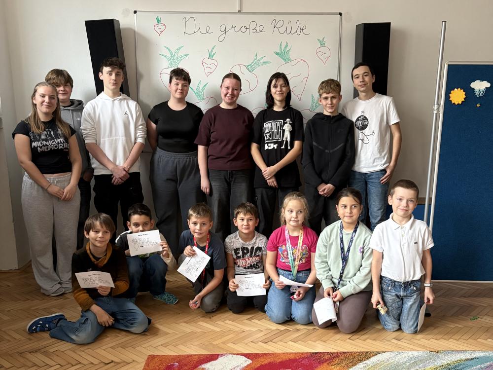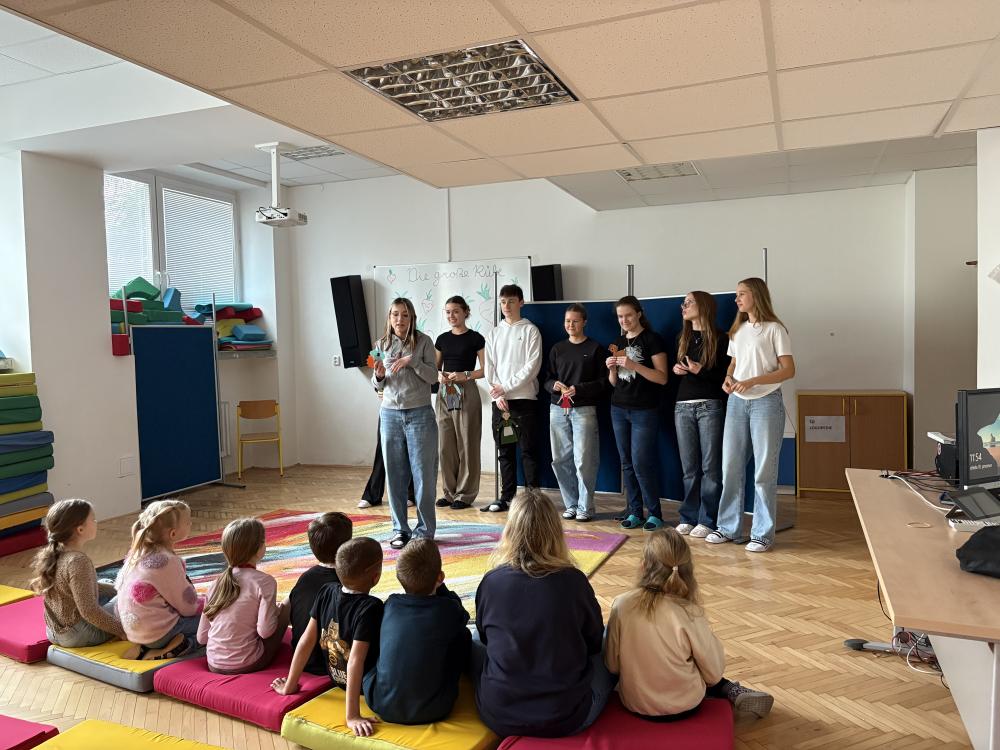 Ve středu a čtvrtek se žáci z nepovinného německého jazyka potkali s prvňáčky a druháčky, kteří s němčinou v zájmovém útvaru teprve začínají. Nejdříve malí žáčci předvedli, co se již stihli v němčině naučit, poté jim žáci devátých tříd zahráli v němčině pohádku O veliké řepě. Všichni si společný čas užili, malí němčináři si odnesli nejen nová slovíčka, ale i omalovánku a sladkou dobrotu.