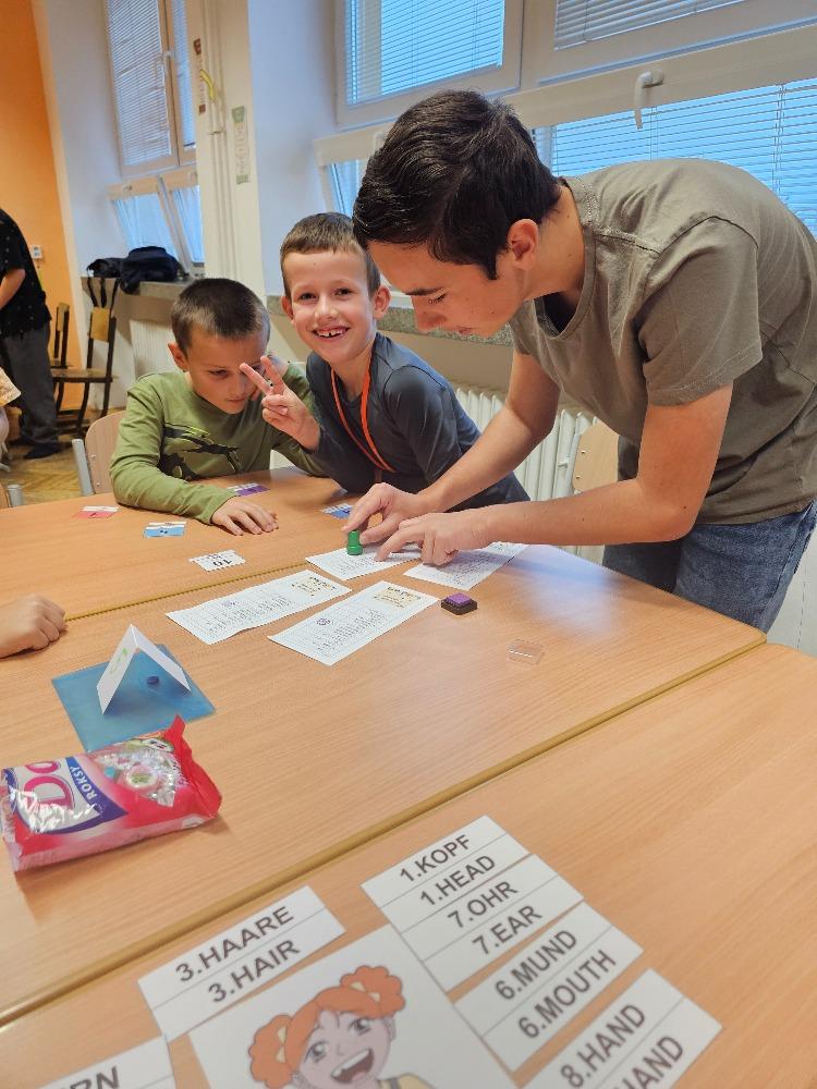 Evropský den jazyků, který se každoročně slaví 26. září, připomíná jazykovou a kulturní rozmanitost Evropy a zároveň podporuje celoživotní učení cizí řeči. Naši deváťáci se této výzvy chopili s nadšením a připravili pro žáky 2. – 5. ročníků pestrá stanoviště plná her, soutěží a aktivit v různých evropských jazycích. Mladší spolužáci si mohli vyzkoušet základní slovíčka, fráze, ale i zajímavosti z kultury jednotlivých zemí. Děti si dopoledne velmi užily, odnesly si nové vědomosti i zážitky a ocenily kreativitu starších spolužáků. Celá akce se nesla v přátelské a veselé atmosféře a potvrdila, že učení jazyků může být nejen užitečné, ale i zábavné.