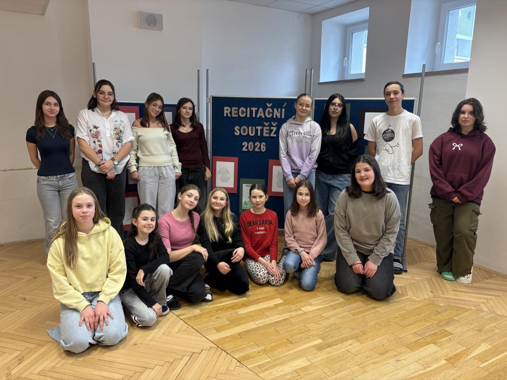 Věděli jste, že s roboty jsou samé trampoty? Tušili jste, že stát se nezaměstnaným vyžaduje značné úsilí? Ptali jste se někdy sami sebe, co asi přináší život se štěňátkem? A co teprve život v úkrytu? Odpovědi na tyto a mnohé jiné otázky přineslo školní kolo recitační soutěže, které se uskutečnilo v pátek 13. 2. 2026. Žáci 6. až 9. ročníku se sešli, aby přednesli své texty a interpretovali je před porotou i publikem. Příjemné setkání plné poezie a prózy potěšilo i pobavilo nejednoho diváka. Soutěžící prokázali nejen pečlivou přípravu, ale také cit pro práci s textem, výraz, tempo a emoce. Porota tak měla opravdu nelehký úkol. Nakonec se podařilo vybrat z řad recitátorů zástupce, kteří budou naši školu reprezentovat v okresním kole 18. 3. 2026. V kategorii 6. a 7. ročníků postupuje Beata Marešová a Josefína Klimánková, v kategorii 8. a 9. ročníků pak Kateřina