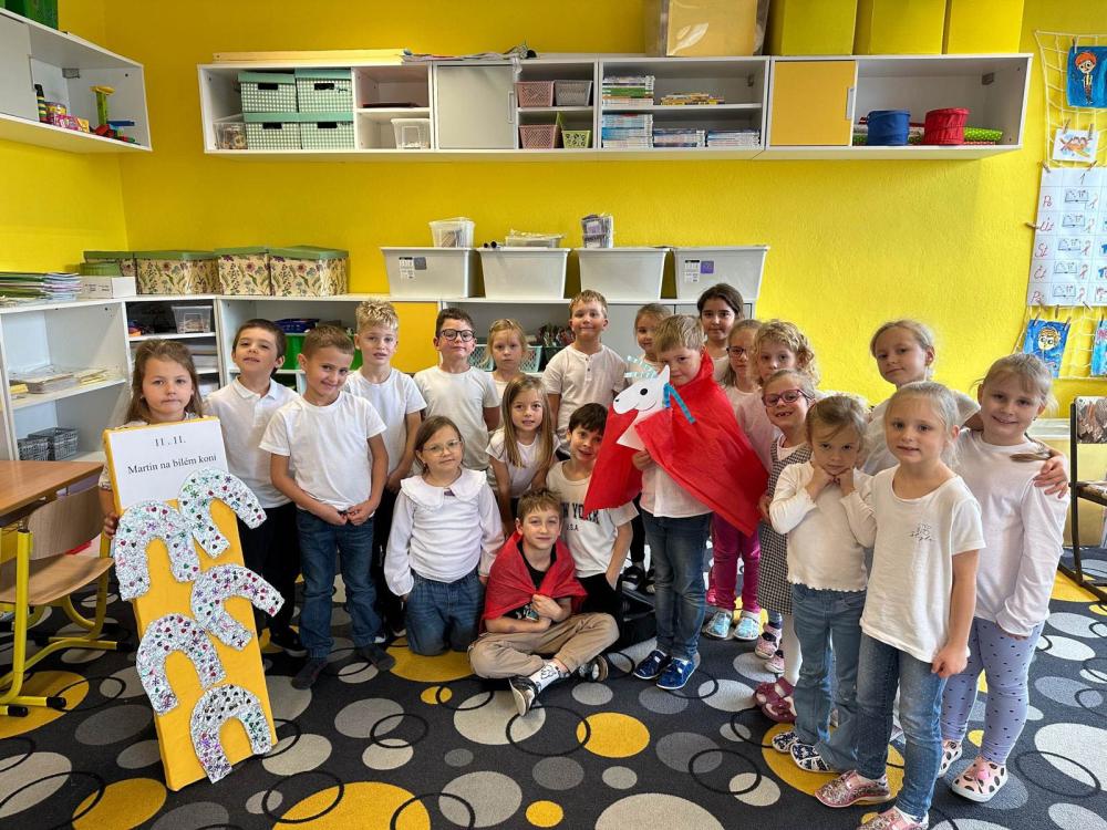 V úterý 11. listopadu se všechny první třídy zapojily do krásného dopoledne věnovaného svátku svatého Martina. Děti se během dne dozvěděly, kdo Martin byl, proč se říká, že „přijíždí na bílém koni“, a jaké zvyky a tradice se k jeho svátku pojí. Kromě povídání si prvňáčci malovali a tvořili nejrůznější obrázky a výrobky s martinskou tématikou – nechyběli koně, podkovy ani vločky, které symbolicky připomněly první sníh.