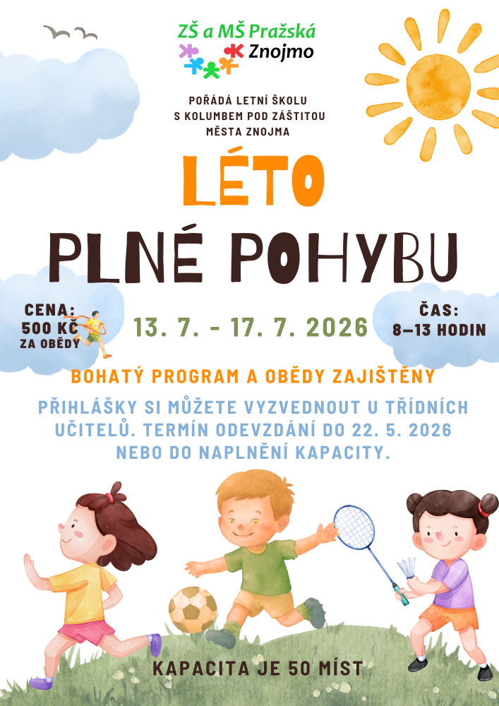 Zveme všechny děti 1. stupně na letní školu Léto plné pohybu, která se uskuteční od 13. do 17. července 2026. Čeká je týden plný her, sportu, zábavy a společných zážitků